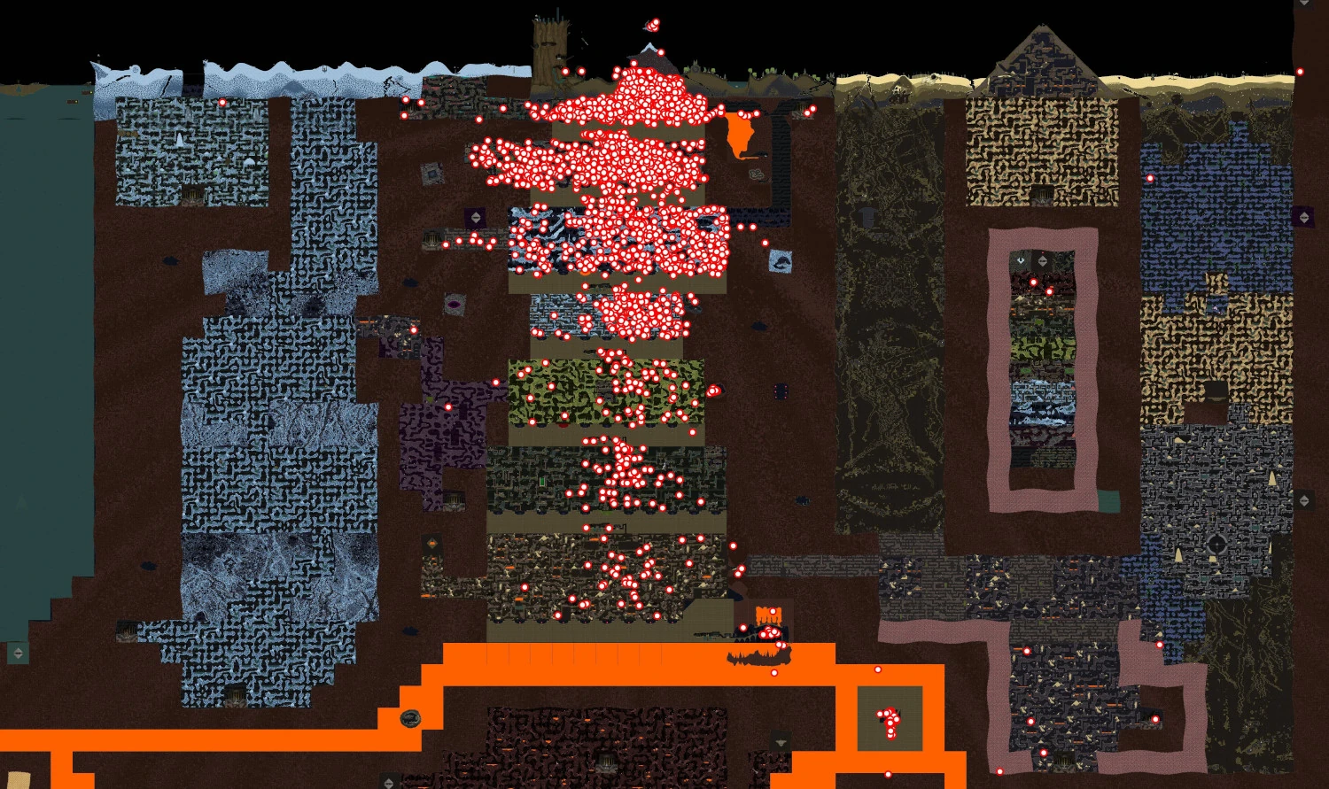 The World of Noita is separated into several Biomes which, at the center of the world can be grouped into several areas in rough succession of depth. At the end of each biome in the Main Path, there will be a Holy Mountain. Biome Modifiers may be applied to most of the main biomes at random, and some biomes like the Desert and Snowy Wasteland have fixed modifiers, or may be generated with a specific modifier by default unless another modifier replaces it. The Biomes are pseudorandomly generated via a combination of "Wang tiles" and "Pixel scenes". See World generation for details.