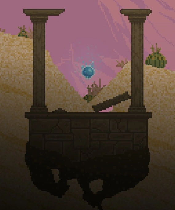 The Essence Eater is an entity of unknown origin found in both the Snowy Wasteland and Desert, each upon a small altar between two stone columns. It resembles a tiny Orb of True Knowledge. When damaged, it will emit small bluish sparks.