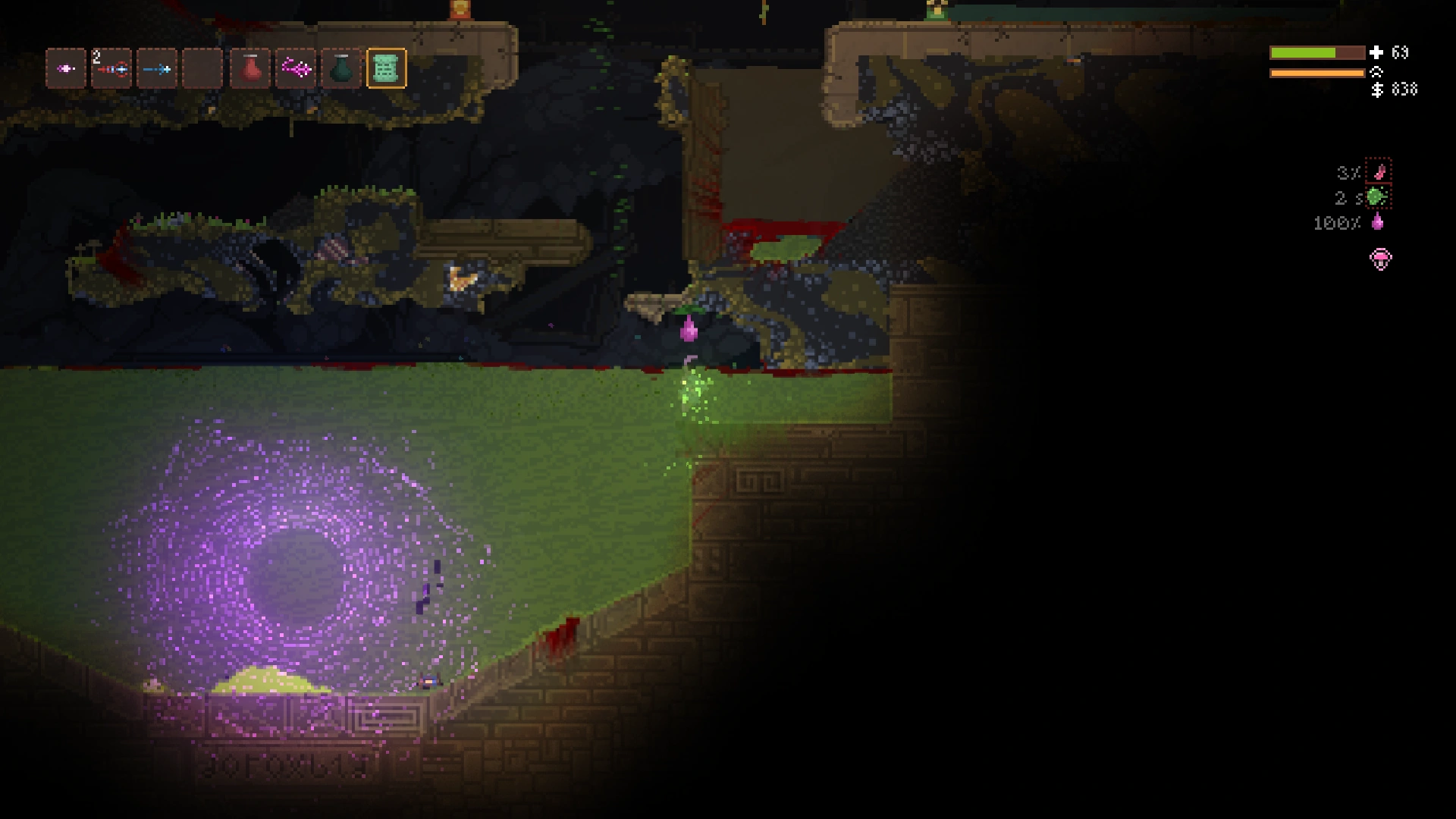 Having a similar appearance to vomit (maintaining various "dirty greens" while omitting vomit's usual orange), consumption causes the gassy effect, and touching the material causes for the character to become slimy.