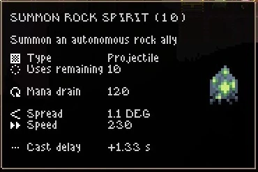 - A fire-and-forget spell, the spirit will do its job without any additional modifiers or specfic wand stats, only held back by its rather low charge limit of 10.